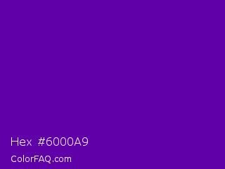Hex #6000a9 Color is a normal purple color and the nearest color is Purple #660099. Hex code #6000a9 and RGB value is rgb(96,0,169). In RGB color space, this color is composed of 38% red, 0% green, 66% blue, In CMYK color space, this color is composed of 43% cyan, 100% magenta, 0% yellow , 34% black , In HSL color space, this color has a hue angle of 274° , 100% saturation and 33% lightness.