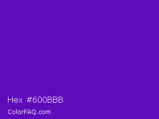 Hex #600bbb Color is a normal violet color and the nearest color is Purple Heart Crayola #652dc1. Hex code #600bbb and RGB value is rgb(96,11,187). In RGB color space, this color is composed of 38% red, 4% green, 73% blue, In CMYK color space, this color is composed of 49% cyan, 94% magenta, 0% yellow , 27% black , In HSL color space, this color has a hue angle of 269° , 89% saturation and 39% lightness.