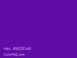 Hex #600da8 Color is a normal purple color and the nearest color is Purple #660099. Hex code #600da8 and RGB value is rgb(96,13,168). In RGB color space, this color is composed of 38% red, 5% green, 66% blue, In CMYK color space, this color is composed of 43% cyan, 92% magenta, 0% yellow , 34% black , In HSL color space, this color has a hue angle of 272° , 86% saturation and 35% lightness.