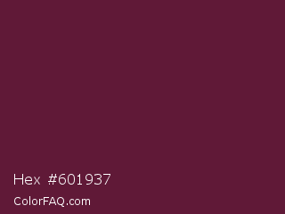Hex #601937 Color is a dark rose color and the nearest color is Wine Berry #591d35. Hex code #601937 and RGB value is rgb(96,25,55). In RGB color space, this color is composed of 38% red, 10% green, 22% blue, In CMYK color space, this color is composed of 0% cyan, 74% magenta, 43% yellow , 62% black , In HSL color space, this color has a hue angle of 335° , 59% saturation and 24% lightness.