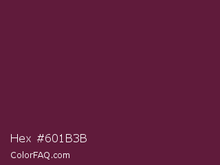Hex #601b3b Color is a dark rose color and the nearest color is Wine Berry #591d35. Hex code #601b3b and RGB value is rgb(96,27,59). In RGB color space, this color is composed of 38% red, 11% green, 23% blue, In CMYK color space, this color is composed of 0% cyan, 72% magenta, 39% yellow , 62% black , In HSL color space, this color has a hue angle of 332° , 56% saturation and 24% lightness.