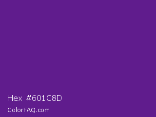 Hex #601c8d Color is a normal purple color and the nearest color is Seance #731e8f. Hex code #601c8d and RGB value is rgb(96,28,141). In RGB color space, this color is composed of 38% red, 11% green, 55% blue, In CMYK color space, this color is composed of 32% cyan, 80% magenta, 0% yellow , 45% black , In HSL color space, this color has a hue angle of 276° , 67% saturation and 33% lightness.