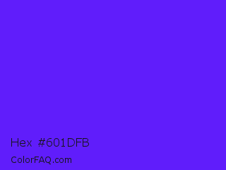 Hex #601dfb Color is a normal indigo color and the nearest color is Han Purple #5218fa. Hex code #601dfb and RGB value is rgb(96,29,251). In RGB color space, this color is composed of 38% red, 11% green, 98% blue, In CMYK color space, this color is composed of 62% cyan, 88% magenta, 0% yellow , 2% black , In HSL color space, this color has a hue angle of 258° , 97% saturation and 55% lightness.