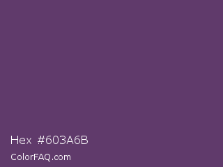 Hex #603a6b Color is a normal purple color and the nearest color is Imperial #602f6b. Hex code #603a6b and RGB value is rgb(96,58,107). In RGB color space, this color is composed of 38% red, 23% green, 42% blue, In CMYK color space, this color is composed of 10% cyan, 46% magenta, 0% yellow , 58% black , In HSL color space, this color has a hue angle of 287° , 30% saturation and 32% lightness.