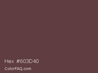 Hex #603d40 Color is a normal red color and the nearest color is Kabul #5e483e. Hex code #603d40 and RGB value is rgb(96,61,64). In RGB color space, this color is composed of 38% red, 24% green, 25% blue, In CMYK color space, this color is composed of 0% cyan, 36% magenta, 33% yellow , 62% black , In HSL color space, this color has a hue angle of 355° , 22% saturation and 31% lightness.
