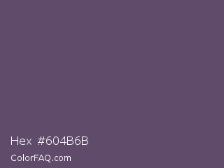 Hex #604b6b Color is a normal purple color and the nearest color is Scarpa Flow #585562. Hex code #604b6b and RGB value is rgb(96,75,107). In RGB color space, this color is composed of 38% red, 29% green, 42% blue, In CMYK color space, this color is composed of 10% cyan, 30% magenta, 0% yellow , 58% black , In HSL color space, this color has a hue angle of 279° , 18% saturation and 36% lightness.