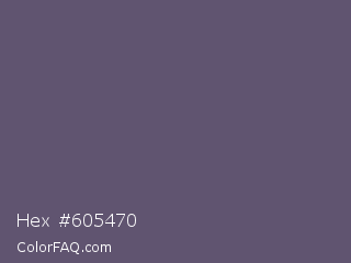 Hex #605470 Color is a normal violet color and the nearest color is Smoky #605b73. Hex code #605470 and RGB value is rgb(96,84,112). In RGB color space, this color is composed of 38% red, 33% green, 44% blue, In CMYK color space, this color is composed of 14% cyan, 25% magenta, 0% yellow , 56% black , In HSL color space, this color has a hue angle of 266° , 14% saturation and 38% lightness.