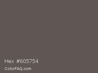 Hex #605754 Color is a normal color and the nearest color is Wenge #645452. Hex code #605754 and RGB value is rgb(96,87,84). In RGB color space, this color is composed of 38% red, 34% green, 33% blue, In CMYK color space, this color is composed of 0% cyan, 9% magenta, 13% yellow , 62% black , In HSL color space, this color has a hue angle of 15° , 7% saturation and 35% lightness.