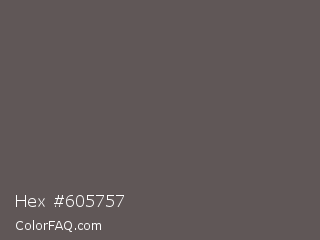 Hex #605757 Color is a normal red color and the nearest color is Chicago #5d5c58. Hex code #605757 and RGB value is rgb(96,87,87). In RGB color space, this color is composed of 38% red, 34% green, 34% blue, In CMYK color space, this color is composed of 0% cyan, 9% magenta, 9% yellow , 62% black , In HSL color space, this color has a hue angle of 0° , 5% saturation and 36% lightness.