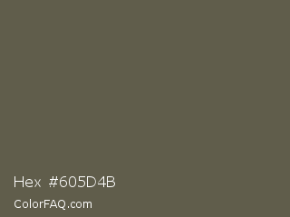 Hex #605d4b Color is a normal yellow color and the nearest color is Finch #626649. Hex code #605d4b and RGB value is rgb(96,93,75). In RGB color space, this color is composed of 38% red, 36% green, 29% blue, In CMYK color space, this color is composed of 0% cyan, 3% magenta, 22% yellow , 62% black , In HSL color space, this color has a hue angle of 51° , 12% saturation and 34% lightness.