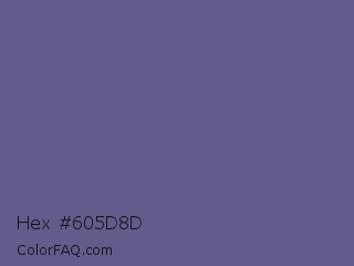 Hex #605d8d Color is a normal indigo color and the nearest color is Dark Blue Gray #666699. Hex code #605d8d and RGB value is rgb(96,93,141). In RGB color space, this color is composed of 38% red, 36% green, 55% blue, In CMYK color space, this color is composed of 32% cyan, 34% magenta, 0% yellow , 45% black , In HSL color space, this color has a hue angle of 244° , 21% saturation and 46% lightness.