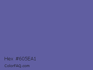 Hex #605ea1 Color is a normal indigo color and the nearest color is Scampi #675fa6. Hex code #605ea1 and RGB value is rgb(96,94,161). In RGB color space, this color is composed of 38% red, 37% green, 63% blue, In CMYK color space, this color is composed of 40% cyan, 42% magenta, 0% yellow , 37% black , In HSL color space, this color has a hue angle of 242° , 26% saturation and 50% lightness.
