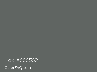 Hex #606562 Color is a normal green color and the nearest color is Storm Dust #646463. Hex code #606562 and RGB value is rgb(96,101,98). In RGB color space, this color is composed of 38% red, 40% green, 38% blue, In CMYK color space, this color is composed of 5% cyan, 0% magenta, 3% yellow , 60% black , In HSL color space, this color has a hue angle of 144° , 3% saturation and 39% lightness.