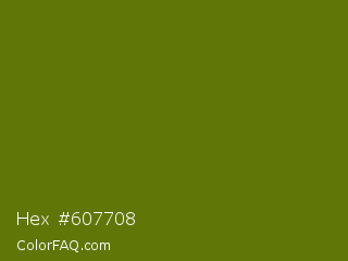 Hex #607708 Color is a dark lime color and the nearest color is Avocado #568203. Hex code #607708 and RGB value is rgb(96,119,8). In RGB color space, this color is composed of 38% red, 47% green, 3% blue, In CMYK color space, this color is composed of 19% cyan, 0% magenta, 93% yellow , 53% black , In HSL color space, this color has a hue angle of 72° , 87% saturation and 25% lightness.