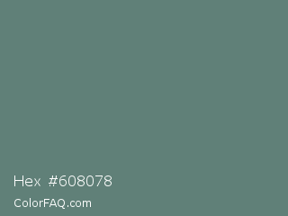 Hex #608078 Color is a normal cyan color and the nearest color is Viridian Green #678975. Hex code #608078 and RGB value is rgb(96,128,120). In RGB color space, this color is composed of 38% red, 50% green, 47% blue, In CMYK color space, this color is composed of 25% cyan, 0% magenta, 6% yellow , 50% black , In HSL color space, this color has a hue angle of 165° , 14% saturation and 44% lightness.