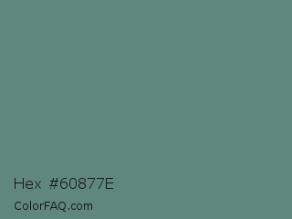Hex #60877e Color is a normal cyan color and the nearest color is Wintergreen Dream #56887d. Hex code #60877e and RGB value is rgb(96,135,126). In RGB color space, this color is composed of 38% red, 53% green, 49% blue, In CMYK color space, this color is composed of 29% cyan, 0% magenta, 7% yellow , 47% black , In HSL color space, this color has a hue angle of 166° , 17% saturation and 45% lightness.