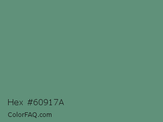 Hex #60917a Color is a normal green color and the nearest color is Viridian Green #678975. Hex code #60917a and RGB value is rgb(96,145,122). In RGB color space, this color is composed of 38% red, 57% green, 48% blue, In CMYK color space, this color is composed of 34% cyan, 0% magenta, 16% yellow , 43% black , In HSL color space, this color has a hue angle of 152° , 20% saturation and 47% lightness.