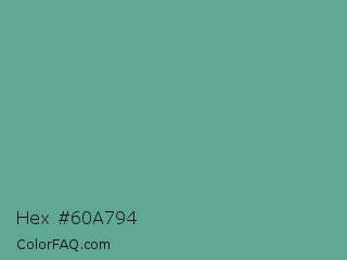 Hex #60a794 Color is a normal cyan color and the nearest color is Polished Pine #5da493. Hex code #60a794 and RGB value is rgb(96,167,148). In RGB color space, this color is composed of 38% red, 65% green, 58% blue, In CMYK color space, this color is composed of 43% cyan, 0% magenta, 11% yellow , 35% black , In HSL color space, this color has a hue angle of 164° , 29% saturation and 52% lightness.