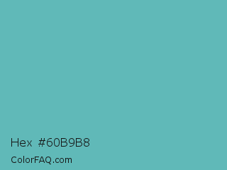 Hex #60b9b8 Color is a normal cyan color and the nearest color is Fountain Blue #56b4be. Hex code #60b9b8 and RGB value is rgb(96,185,184). In RGB color space, this color is composed of 38% red, 73% green, 72% blue, In CMYK color space, this color is composed of 48% cyan, 0% magenta, 1% yellow , 27% black , In HSL color space, this color has a hue angle of 179° , 39% saturation and 55% lightness.