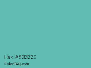 Hex #60bbb0 Color is a normal cyan color and the nearest color is Tradewind #5fb3ac. Hex code #60bbb0 and RGB value is rgb(96,187,176). In RGB color space, this color is composed of 38% red, 73% green, 69% blue, In CMYK color space, this color is composed of 49% cyan, 0% magenta, 6% yellow , 27% black , In HSL color space, this color has a hue angle of 173° , 40% saturation and 55% lightness.