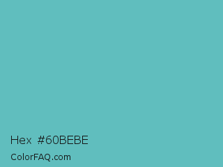 Hex #60bebe Color is a normal cyan color and the nearest color is Fountain Blue #56b4be. Hex code #60bebe and RGB value is rgb(96,190,190). In RGB color space, this color is composed of 38% red, 75% green, 75% blue, In CMYK color space, this color is composed of 49% cyan, 0% magenta, 0% yellow , 25% black , In HSL color space, this color has a hue angle of 180° , 42% saturation and 56% lightness.