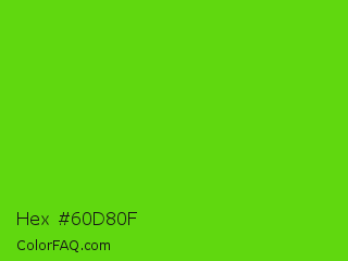 Hex #60d80f Color is a normal green color and the nearest color is Harlequin Green #46cb18. Hex code #60d80f and RGB value is rgb(96,216,15). In RGB color space, this color is composed of 38% red, 85% green, 6% blue, In CMYK color space, this color is composed of 56% cyan, 0% magenta, 93% yellow , 15% black , In HSL color space, this color has a hue angle of 96° , 87% saturation and 45% lightness.