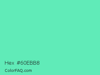 Hex #60ebb8 Color is a light green color and the nearest color is Medium Aquamarine #66ddaa. Hex code #60ebb8 and RGB value is rgb(96,235,184). In RGB color space, this color is composed of 38% red, 92% green, 72% blue, In CMYK color space, this color is composed of 59% cyan, 0% magenta, 22% yellow , 8% black , In HSL color space, this color has a hue angle of 158° , 78% saturation and 65% lightness.