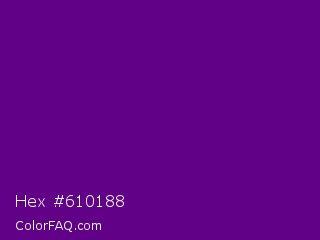 Hex #610188 Color is a dark purple color and the nearest color is Purple #660099. Hex code #610188 and RGB value is rgb(97,1,136). In RGB color space, this color is composed of 38% red, 0% green, 53% blue, In CMYK color space, this color is composed of 29% cyan, 99% magenta, 0% yellow , 47% black , In HSL color space, this color has a hue angle of 283° , 99% saturation and 27% lightness.