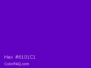 Hex #6101c1 Color is a normal violet color and the nearest color is Purple #660099. Hex code #6101c1 and RGB value is rgb(97,1,193). In RGB color space, this color is composed of 38% red, 0% green, 76% blue, In CMYK color space, this color is composed of 50% cyan, 99% magenta, 0% yellow , 24% black , In HSL color space, this color has a hue angle of 270° , 99% saturation and 38% lightness.
