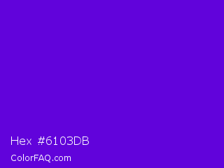 Hex #6103db Color is a normal violet color and the nearest color is Electric Indigo #6f00ff. Hex code #6103db and RGB value is rgb(97,3,219). In RGB color space, this color is composed of 38% red, 1% green, 86% blue, In CMYK color space, this color is composed of 56% cyan, 99% magenta, 0% yellow , 14% black , In HSL color space, this color has a hue angle of 266° , 97% saturation and 44% lightness.