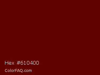 Hex #610400 Color is a very dark red color and the nearest color is Rosewood #65000b. Hex code #610400 and RGB value is rgb(97,4,0). In RGB color space, this color is composed of 38% red, 2% green, 0% blue, In CMYK color space, this color is composed of 0% cyan, 96% magenta, 100% yellow , 62% black , In HSL color space, this color has a hue angle of 2° , 100% saturation and 19% lightness.