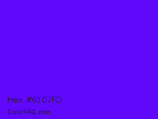 Hex #6107fd Color is a normal violet color and the nearest color is Electric Indigo #6f00ff. Hex code #6107fd and RGB value is rgb(97,7,253). In RGB color space, this color is composed of 38% red, 3% green, 99% blue, In CMYK color space, this color is composed of 62% cyan, 97% magenta, 0% yellow , 1% black , In HSL color space, this color has a hue angle of 262° , 98% saturation and 51% lightness.