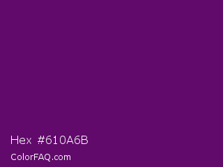 Hex #610a6b Color is a dark magenta color and the nearest color is Honey Flower #4f1c70. Hex code #610a6b and RGB value is rgb(97,10,107). In RGB color space, this color is composed of 38% red, 4% green, 42% blue, In CMYK color space, this color is composed of 9% cyan, 91% magenta, 0% yellow , 58% black , In HSL color space, this color has a hue angle of 294° , 83% saturation and 23% lightness.