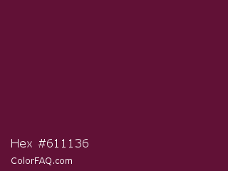 Hex #611136 Color is a very dark rose color and the nearest color is Mulberry Wood #5c0536. Hex code #611136 and RGB value is rgb(97,17,54). In RGB color space, this color is composed of 38% red, 7% green, 21% blue, In CMYK color space, this color is composed of 0% cyan, 82% magenta, 44% yellow , 62% black , In HSL color space, this color has a hue angle of 332° , 70% saturation and 22% lightness.