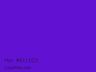 Hex #6111d2 Color is a normal violet color and the nearest color is Purple Heart Crayola #652dc1. Hex code #6111d2 and RGB value is rgb(97,17,210). In RGB color space, this color is composed of 38% red, 7% green, 82% blue, In CMYK color space, this color is composed of 54% cyan, 92% magenta, 0% yellow , 18% black , In HSL color space, this color has a hue angle of 265° , 85% saturation and 45% lightness.