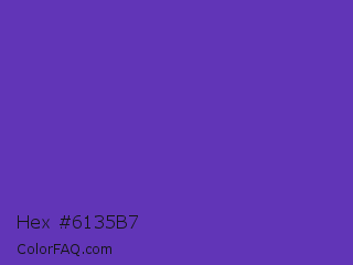 Hex #6135b7 Color is a normal indigo color and the nearest color is Purple Heart Crayola #652dc1. Hex code #6135b7 and RGB value is rgb(97,53,183). In RGB color space, this color is composed of 38% red, 21% green, 72% blue, In CMYK color space, this color is composed of 47% cyan, 71% magenta, 0% yellow , 28% black , In HSL color space, this color has a hue angle of 260° , 55% saturation and 46% lightness.