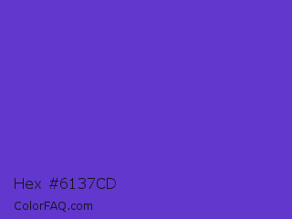 Hex #6137cd Color is a normal indigo color and the nearest color is Purple Heart Crayola #652dc1. Hex code #6137cd and RGB value is rgb(97,55,205). In RGB color space, this color is composed of 38% red, 22% green, 80% blue, In CMYK color space, this color is composed of 53% cyan, 73% magenta, 0% yellow , 20% black , In HSL color space, this color has a hue angle of 257° , 60% saturation and 51% lightness.
