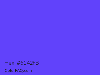 Hex #6142fb Color is a light indigo color and the nearest color is Majorelle Blue #6050dc. Hex code #6142fb and RGB value is rgb(97,66,251). In RGB color space, this color is composed of 38% red, 26% green, 98% blue, In CMYK color space, this color is composed of 61% cyan, 74% magenta, 0% yellow , 2% black , In HSL color space, this color has a hue angle of 250° , 96% saturation and 62% lightness.