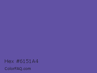 Hex #6151a4 Color is a normal indigo color and the nearest color is Butterfly Bush #624e9a. Hex code #6151a4 and RGB value is rgb(97,81,164). In RGB color space, this color is composed of 38% red, 32% green, 64% blue, In CMYK color space, this color is composed of 41% cyan, 51% magenta, 0% yellow , 36% black , In HSL color space, this color has a hue angle of 252° , 34% saturation and 48% lightness.