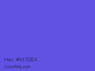 Hex #6152e4 Color is a light indigo color and the nearest color is Majorelle Blue #6050dc. Hex code #6152e4 and RGB value is rgb(97,82,228). In RGB color space, this color is composed of 38% red, 32% green, 89% blue, In CMYK color space, this color is composed of 57% cyan, 64% magenta, 0% yellow , 11% black , In HSL color space, this color has a hue angle of 246° , 73% saturation and 61% lightness.