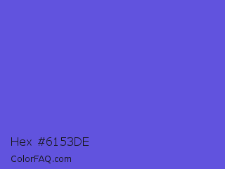 Hex #6153de Color is a normal indigo color and the nearest color is Majorelle Blue #6050dc. Hex code #6153de and RGB value is rgb(97,83,222). In RGB color space, this color is composed of 38% red, 33% green, 87% blue, In CMYK color space, this color is composed of 56% cyan, 63% magenta, 0% yellow , 13% black , In HSL color space, this color has a hue angle of 246° , 68% saturation and 60% lightness.
