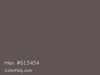 Hex #615454 Color is a normal red color and the nearest color is Wenge #645452. Hex code #615454 and RGB value is rgb(97,84,84). In RGB color space, this color is composed of 38% red, 33% green, 33% blue, In CMYK color space, this color is composed of 0% cyan, 13% magenta, 13% yellow , 62% black , In HSL color space, this color has a hue angle of 0° , 7% saturation and 35% lightness.