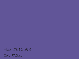 Hex #615598 Color is a normal indigo color and the nearest color is Butterfly Bush #624e9a. Hex code #615598 and RGB value is rgb(97,85,152). In RGB color space, this color is composed of 38% red, 33% green, 60% blue, In CMYK color space, this color is composed of 36% cyan, 44% magenta, 0% yellow , 40% black , In HSL color space, this color has a hue angle of 251° , 28% saturation and 46% lightness.