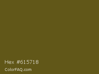 Hex #615718 Color is a dark yellow color and the nearest color is West Coast #625119. Hex code #615718 and RGB value is rgb(97,87,24). In RGB color space, this color is composed of 38% red, 34% green, 9% blue, In CMYK color space, this color is composed of 0% cyan, 10% magenta, 75% yellow , 62% black , In HSL color space, this color has a hue angle of 52° , 60% saturation and 24% lightness.