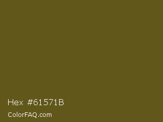 Hex #61571b Color is a dark yellow color and the nearest color is West Coast #625119. Hex code #61571b and RGB value is rgb(97,87,27). In RGB color space, this color is composed of 38% red, 34% green, 11% blue, In CMYK color space, this color is composed of 0% cyan, 10% magenta, 72% yellow , 62% black , In HSL color space, this color has a hue angle of 51° , 56% saturation and 24% lightness.