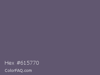 Hex #615770 Color is a normal violet color and the nearest color is Smoky #605b73. Hex code #615770 and RGB value is rgb(97,87,112). In RGB color space, this color is composed of 38% red, 34% green, 44% blue, In CMYK color space, this color is composed of 13% cyan, 22% magenta, 0% yellow , 56% black , In HSL color space, this color has a hue angle of 264° , 13% saturation and 39% lightness.
