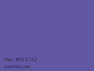 Hex #6157a2 Color is a normal indigo color and the nearest color is Scampi #675fa6. Hex code #6157a2 and RGB value is rgb(97,87,162). In RGB color space, this color is composed of 38% red, 34% green, 64% blue, In CMYK color space, this color is composed of 40% cyan, 46% magenta, 0% yellow , 36% black , In HSL color space, this color has a hue angle of 248° , 30% saturation and 49% lightness.