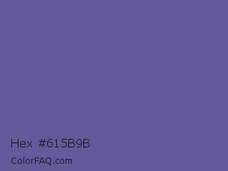 Hex #615b9b Color is a normal indigo color and the nearest color is Dark Blue Gray #666699. Hex code #615b9b and RGB value is rgb(97,91,155). In RGB color space, this color is composed of 38% red, 36% green, 61% blue, In CMYK color space, this color is composed of 37% cyan, 41% magenta, 0% yellow , 39% black , In HSL color space, this color has a hue angle of 246° , 26% saturation and 48% lightness.
