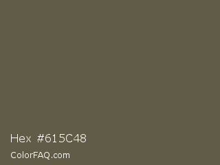 Hex #615c48 Color is a normal yellow color and the nearest color is Finch #626649. Hex code #615c48 and RGB value is rgb(97,92,72). In RGB color space, this color is composed of 38% red, 36% green, 28% blue, In CMYK color space, this color is composed of 0% cyan, 5% magenta, 26% yellow , 62% black , In HSL color space, this color has a hue angle of 48° , 15% saturation and 33% lightness.