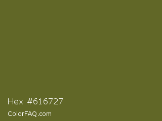 Hex #616727 Color is a dark yellow color and the nearest color is Costa Del Sol #615d30. Hex code #616727 and RGB value is rgb(97,103,39). In RGB color space, this color is composed of 38% red, 40% green, 15% blue, In CMYK color space, this color is composed of 6% cyan, 0% magenta, 62% yellow , 60% black , In HSL color space, this color has a hue angle of 66° , 45% saturation and 28% lightness.